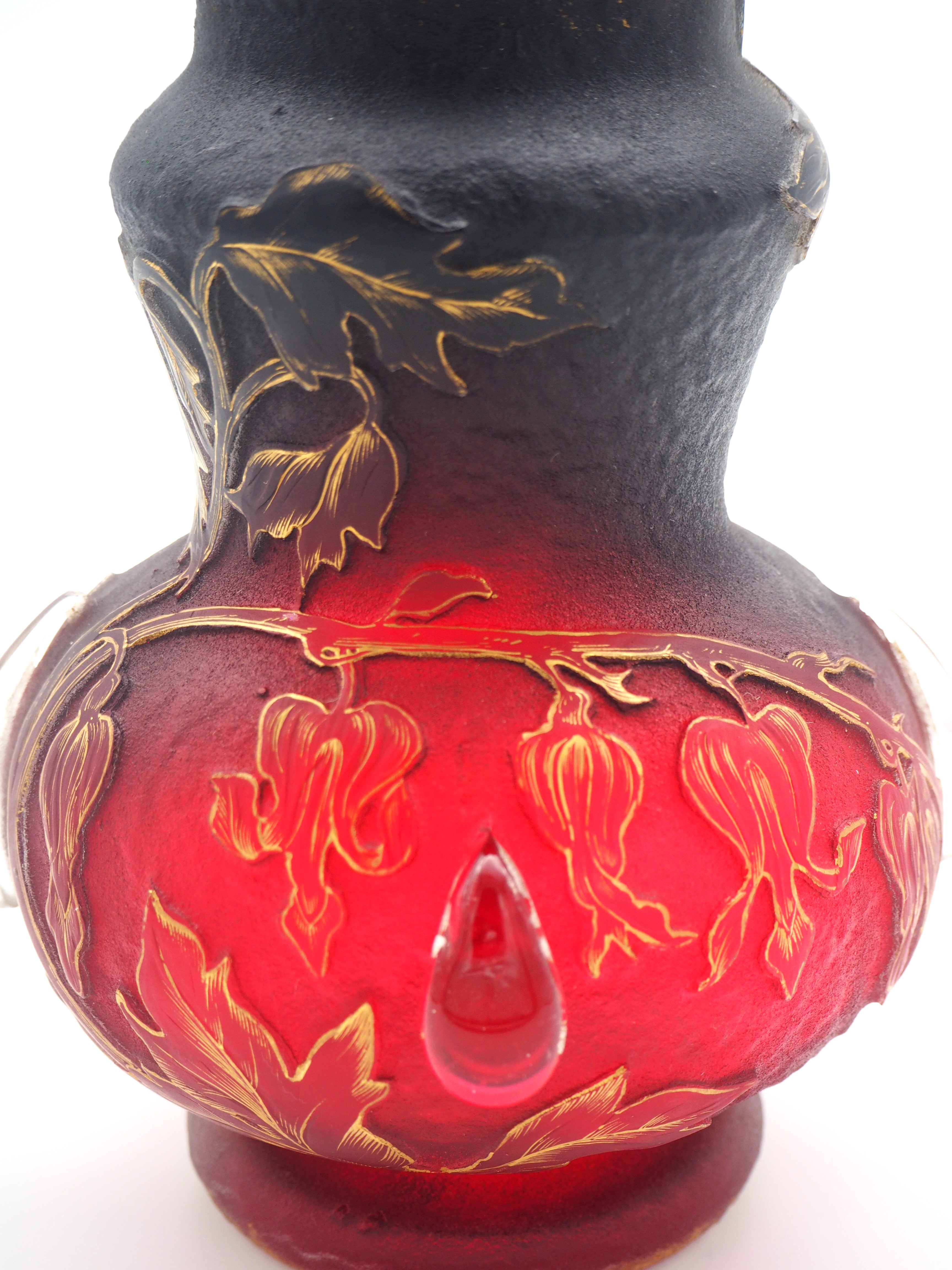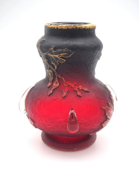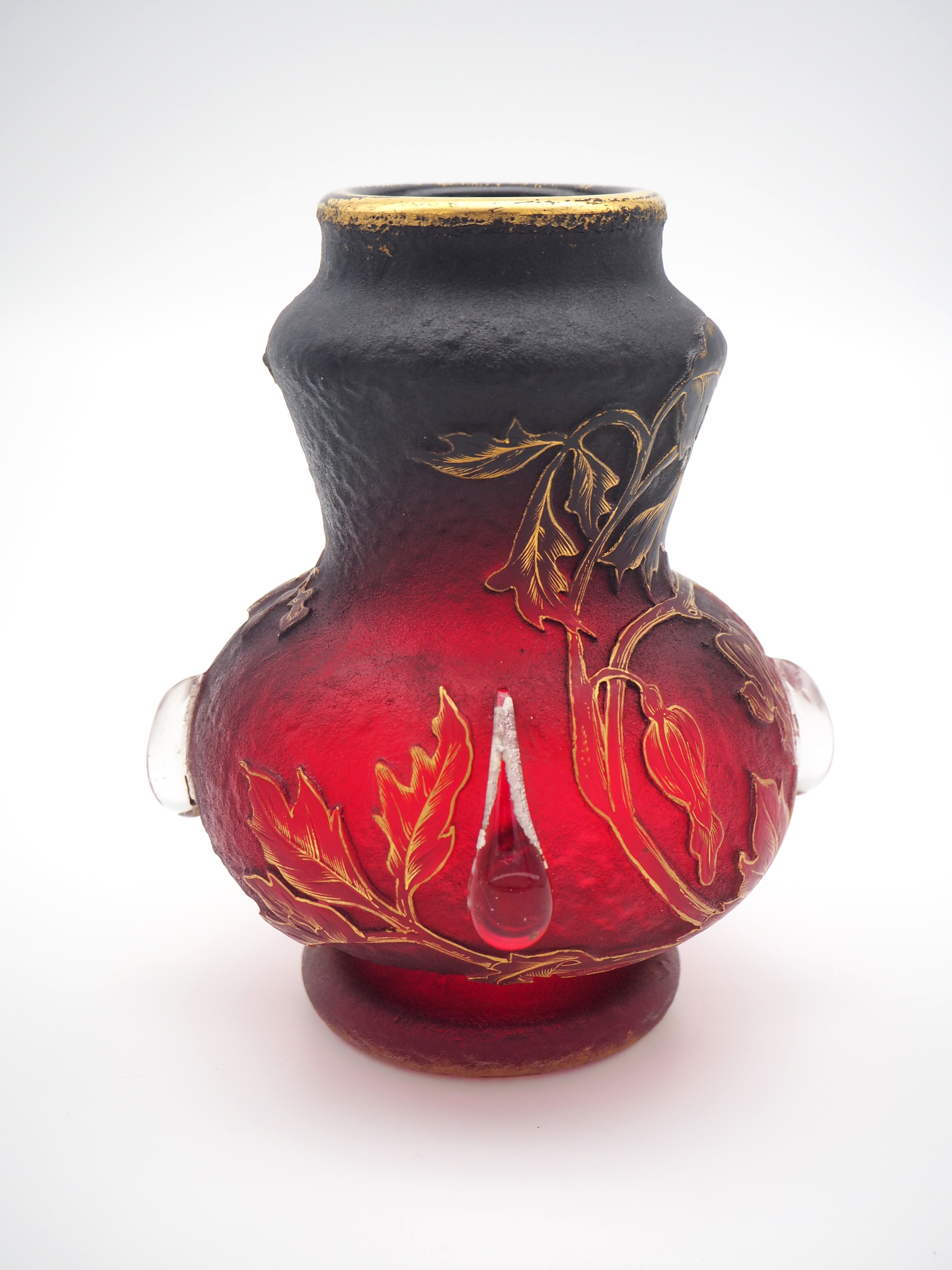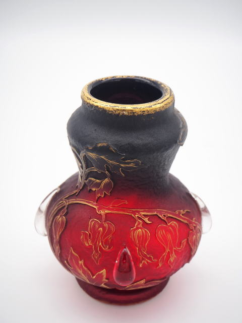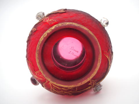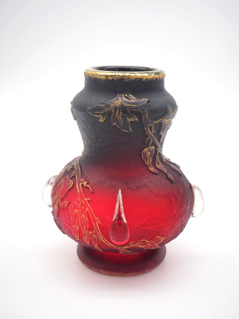 この作品について問い合わせる ドーム・ナンシー 花文様 カボション付 角瓶 (技法:酸化腐食彫り・金彩・カボション) H.18cm W.14cm \380,000 (税込 \418,000)