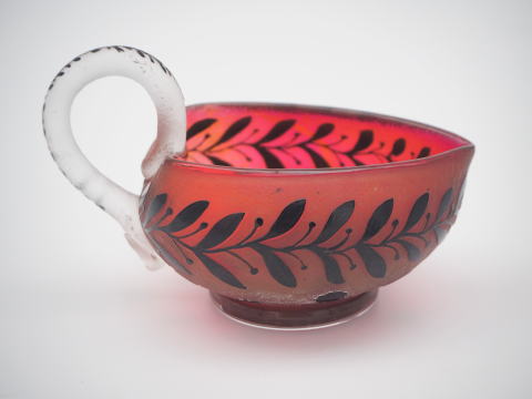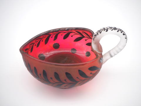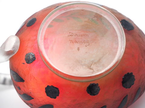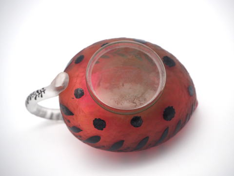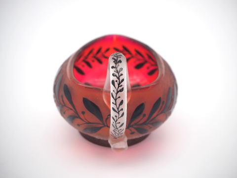 この作品について問い合わせる ドーム・ナンシー 葉文様 ピッチャー (技法:酸化腐食彫り・エナメル彩・アプリカシオンによる取っ手) H.7cm W.11.5cm SOLD