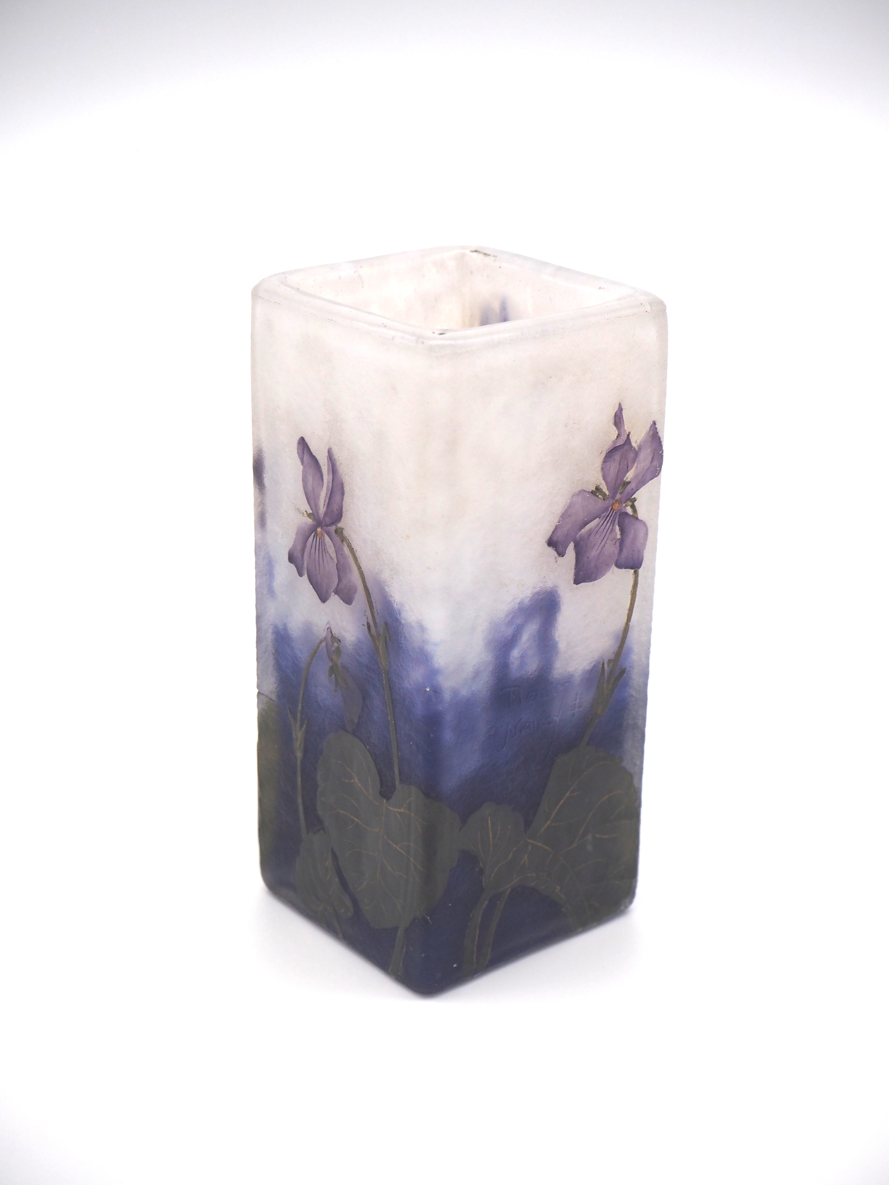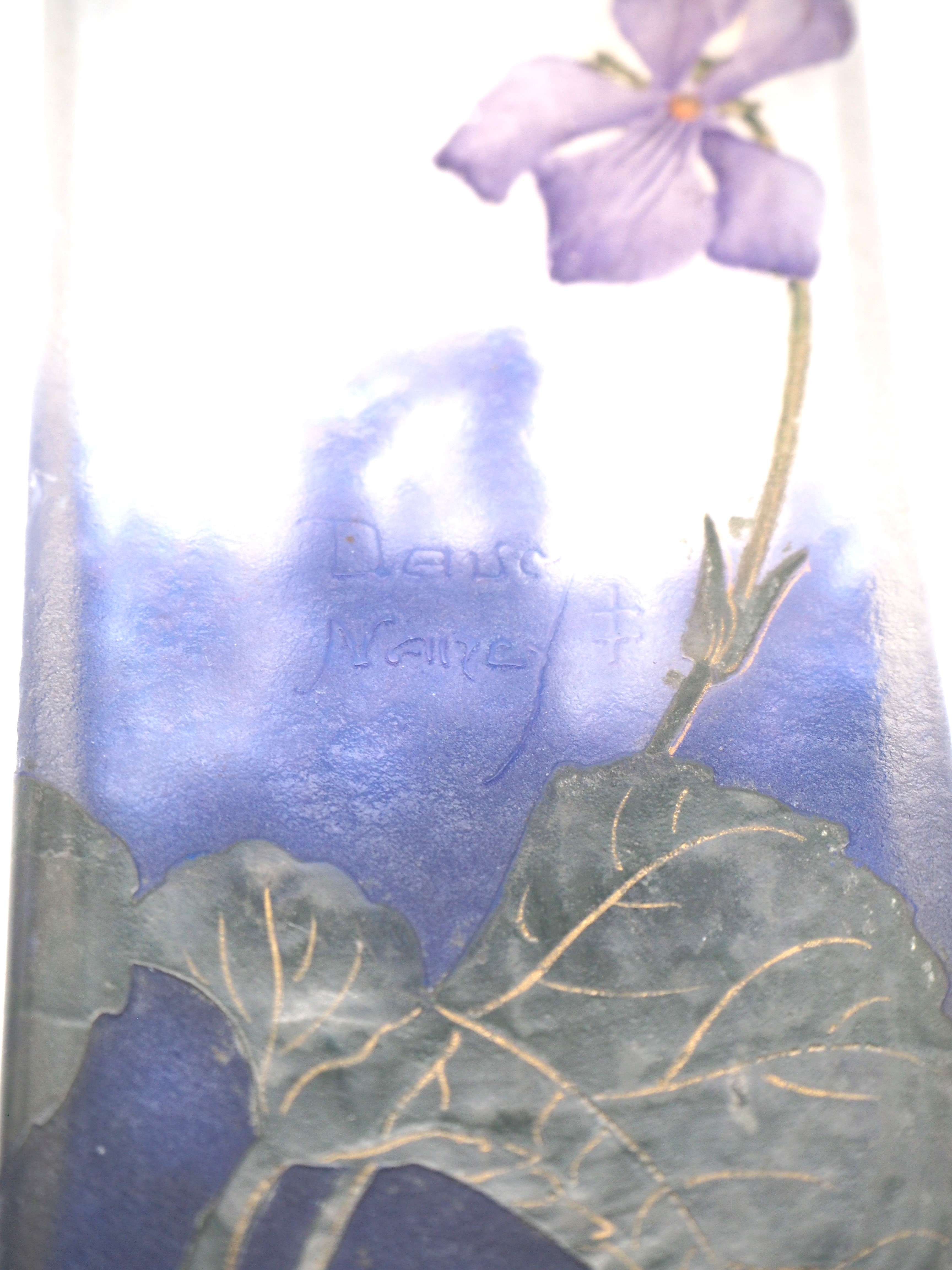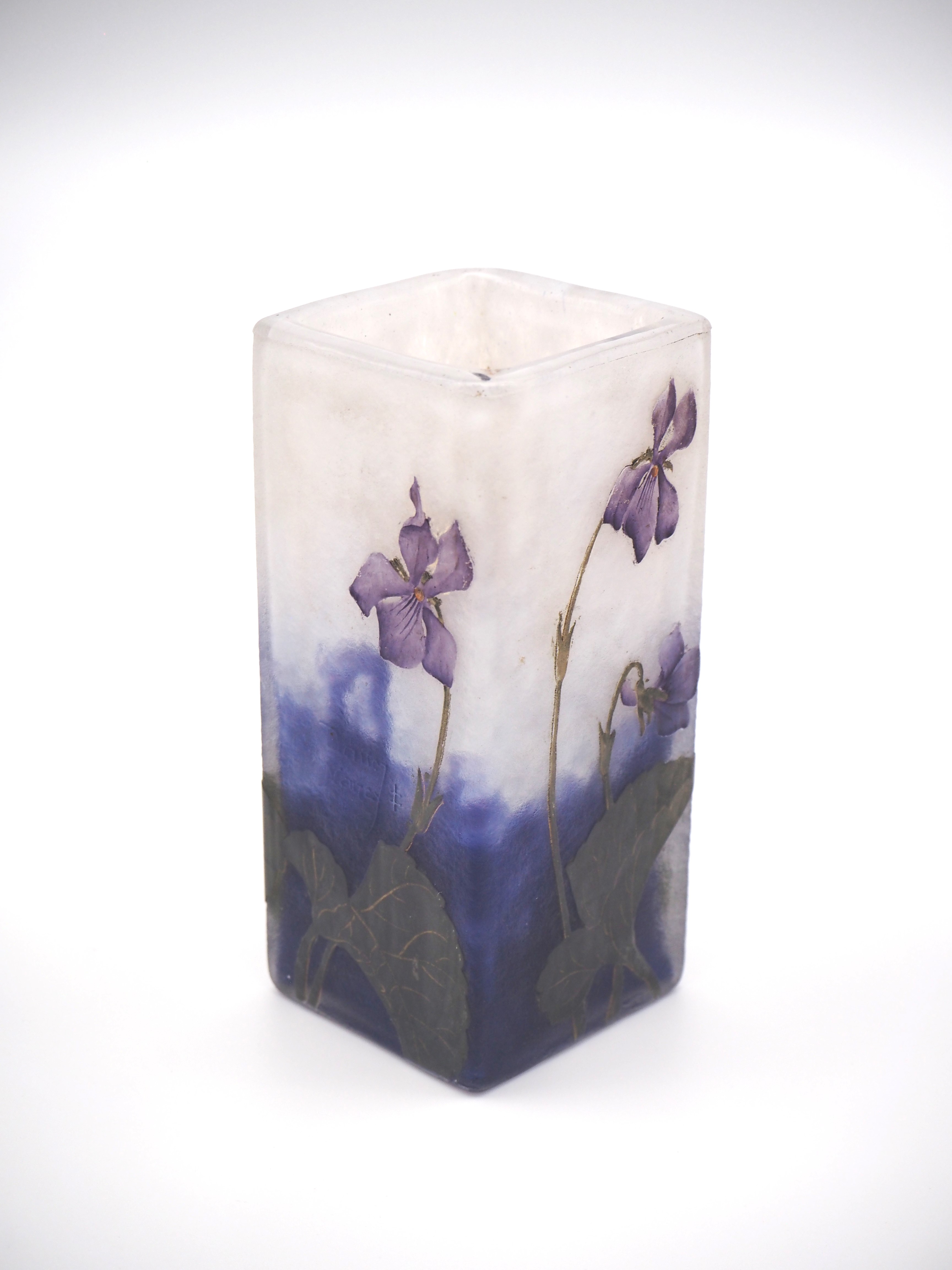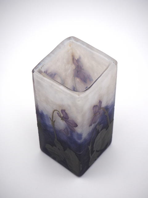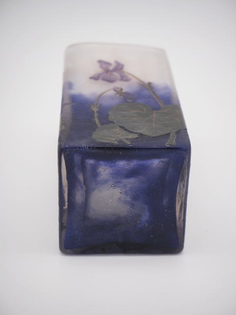 この作品について問い合わせる ドーム・ナンシー スミレ文様 角瓶 (技法:酸化腐食彫り・エナメル彩・金彩) H.5.5cm W.12cm SOLD