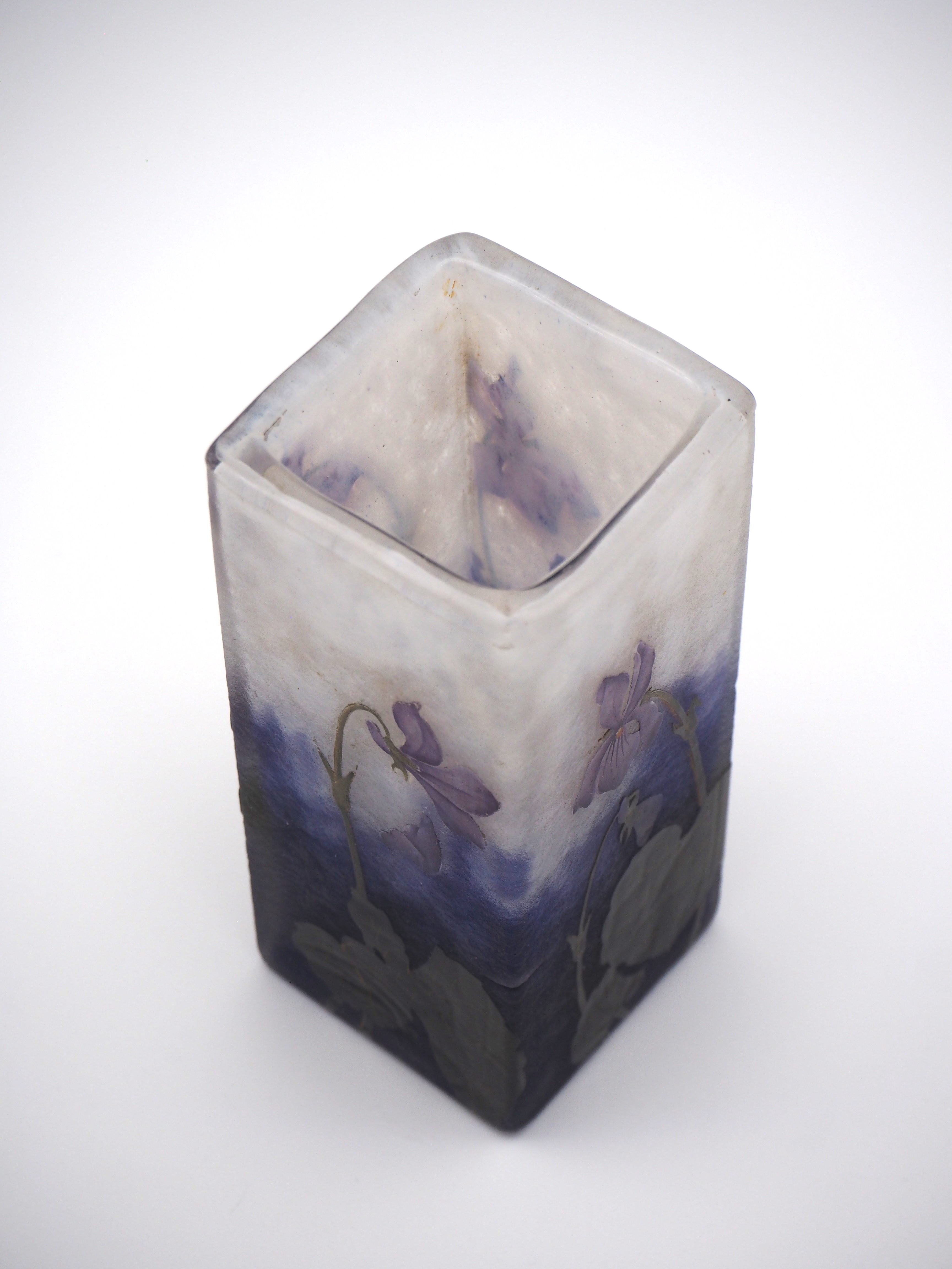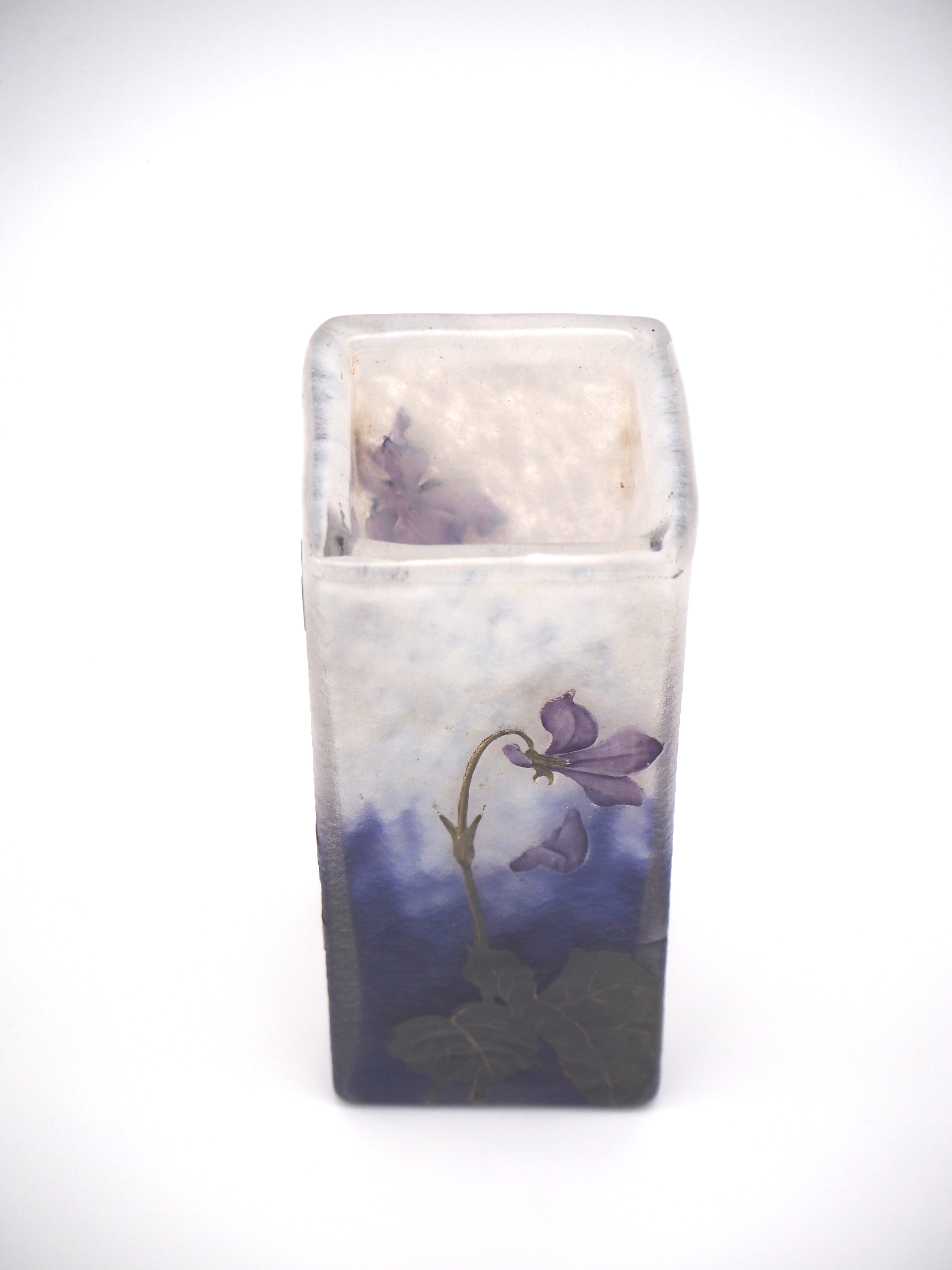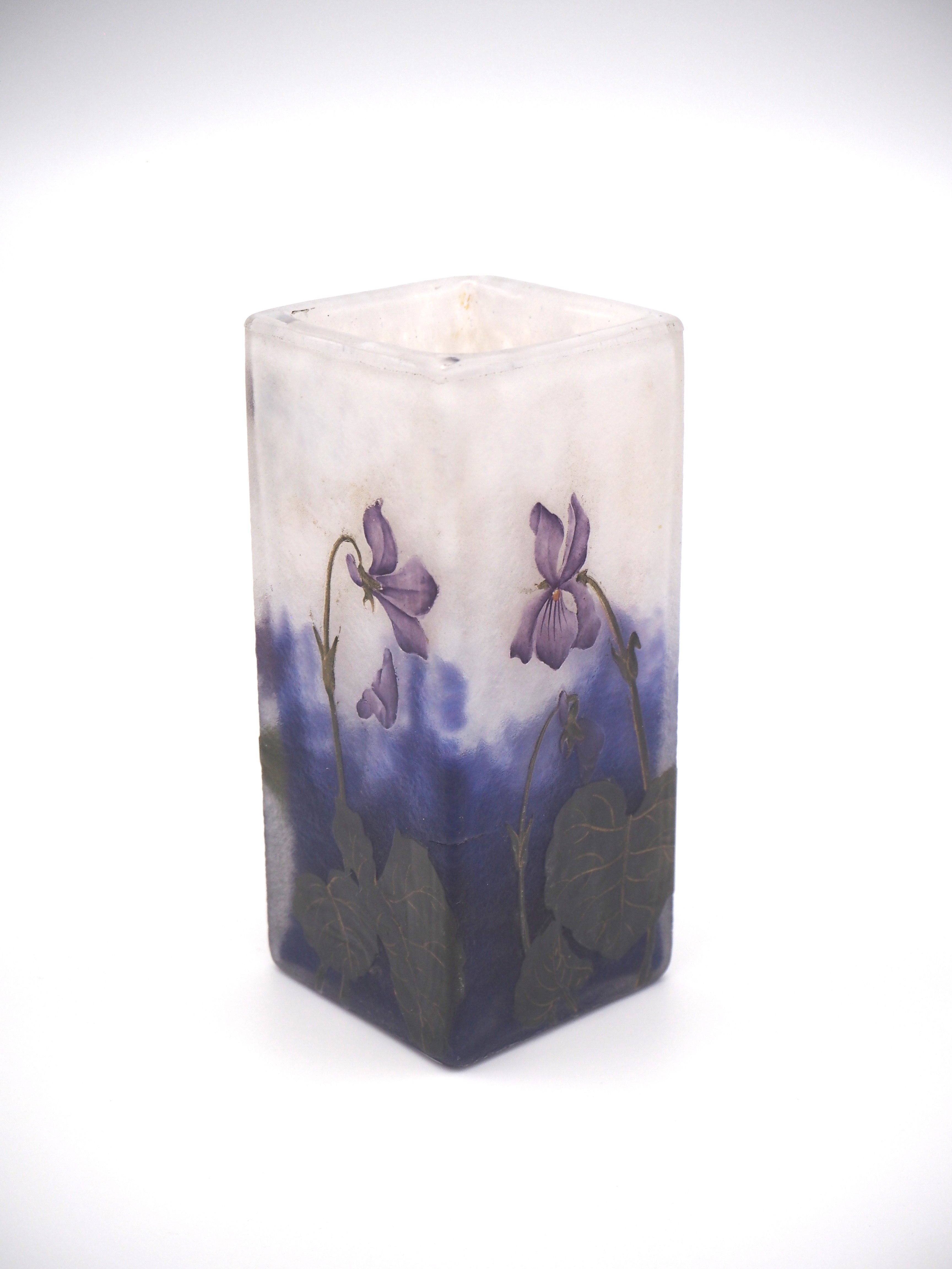この作品について問い合わせる ドーム・ナンシー スミレ文様 角瓶 (技法:酸化腐食彫り・エナメル彩・金彩) H.5.5cm W.12cm SOLD