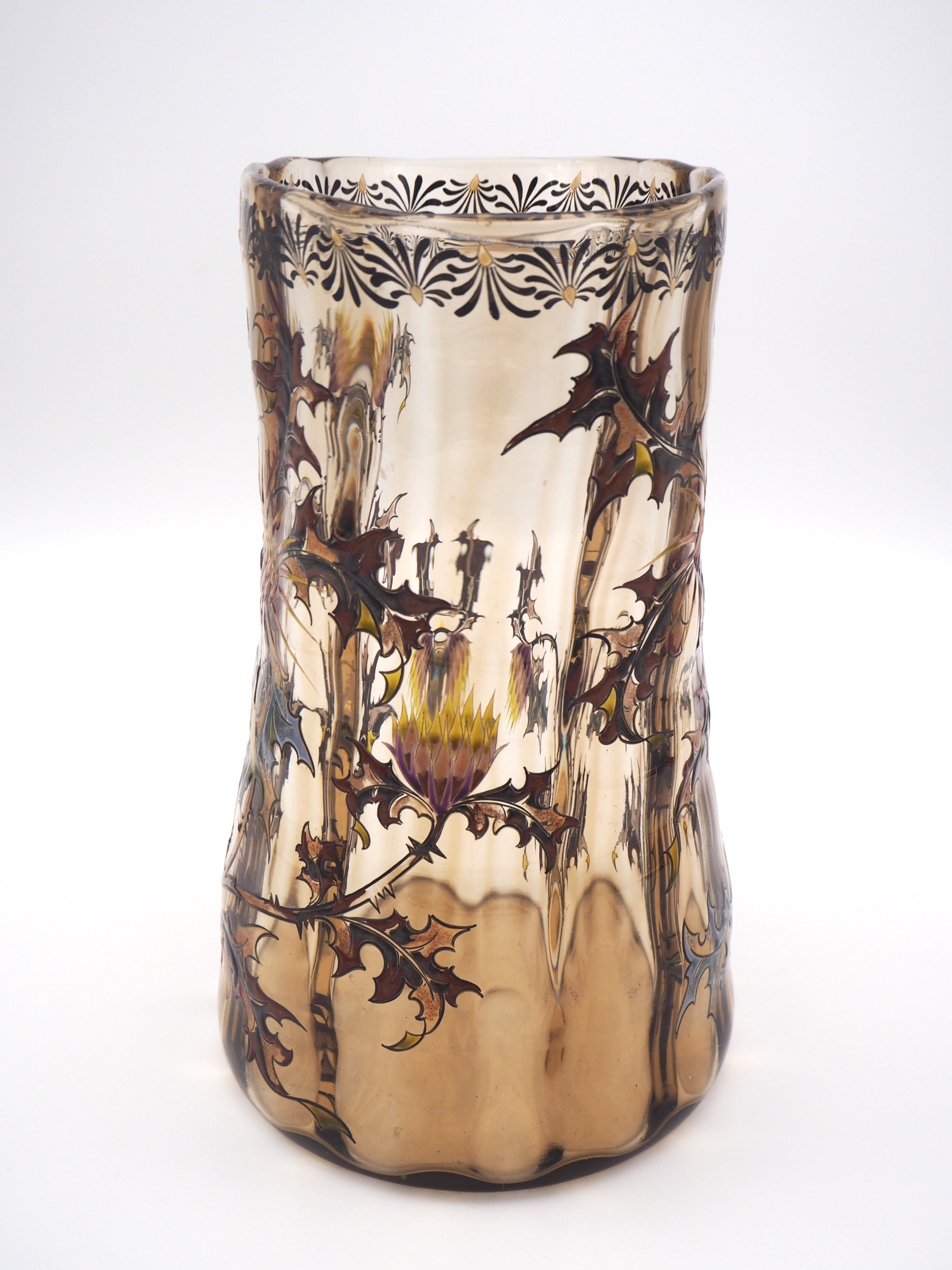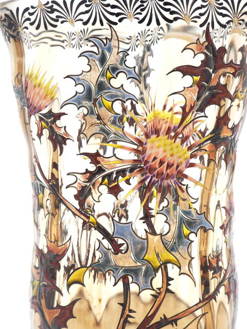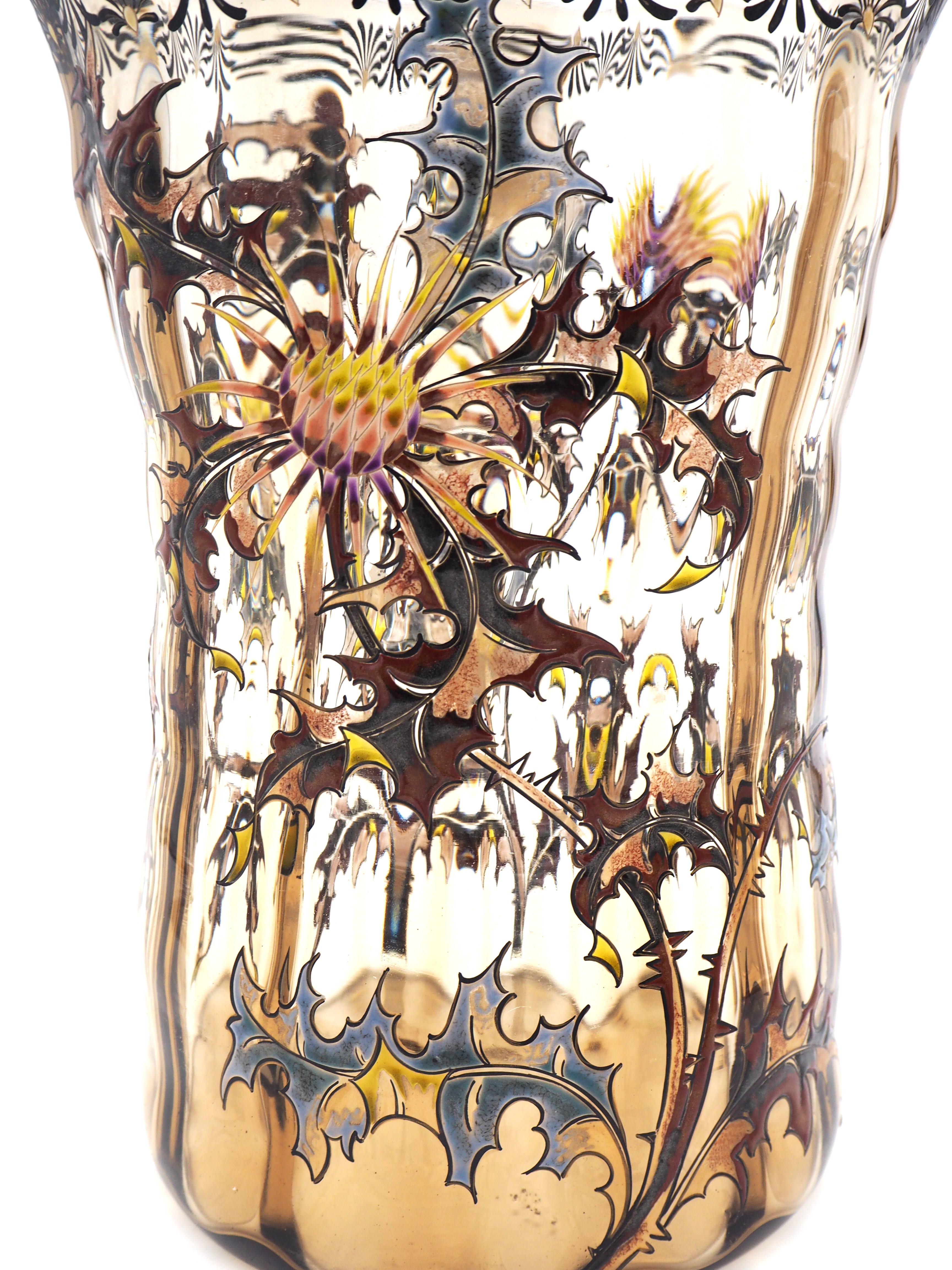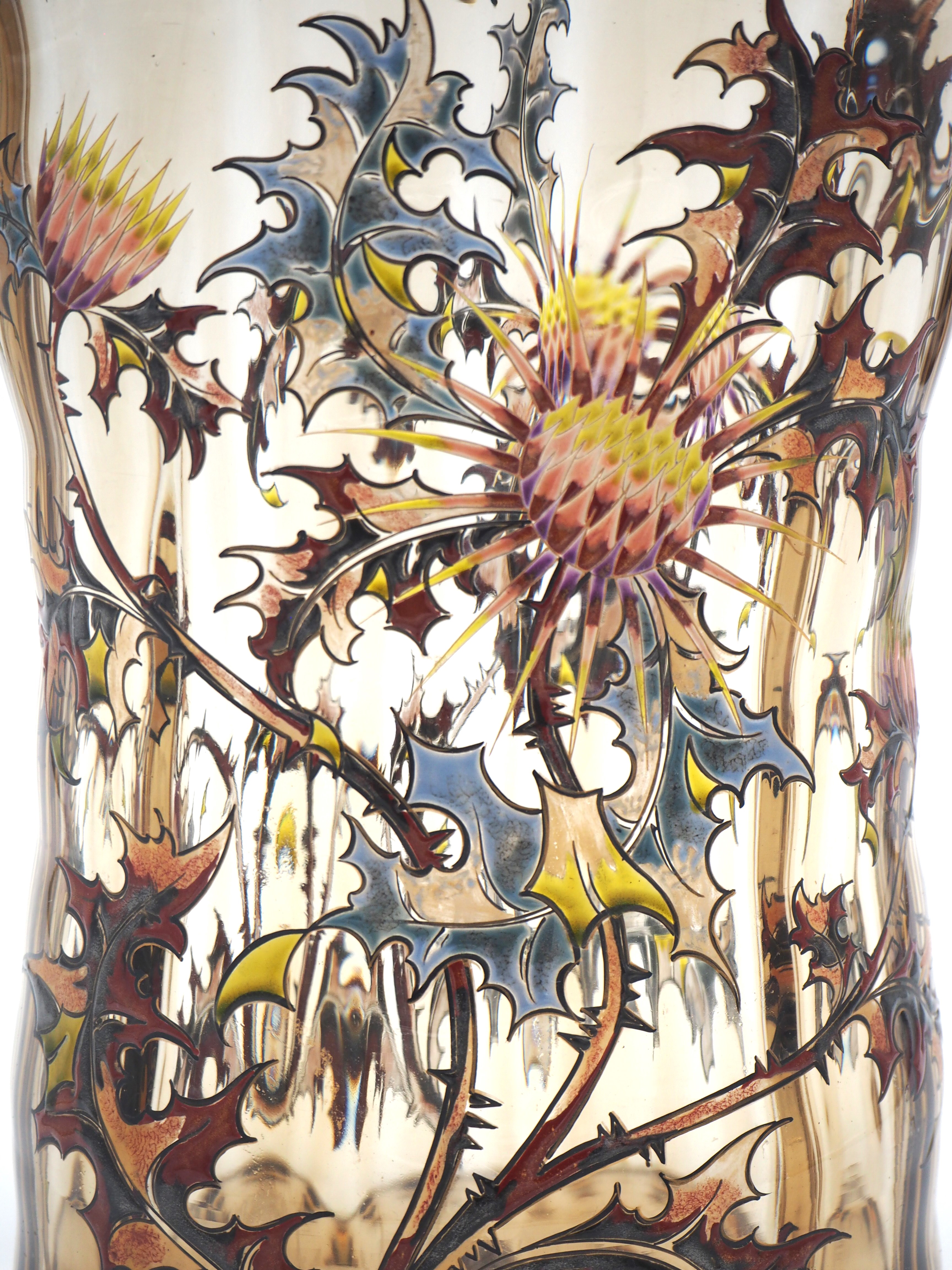 この作品について問い合わせる エミール・ガレ 薊文様 エナメル彩 花瓶 (技法:エナメル彩・金彩) H.32cm W.23cm \3,000,000 (税込 \3,300,000)