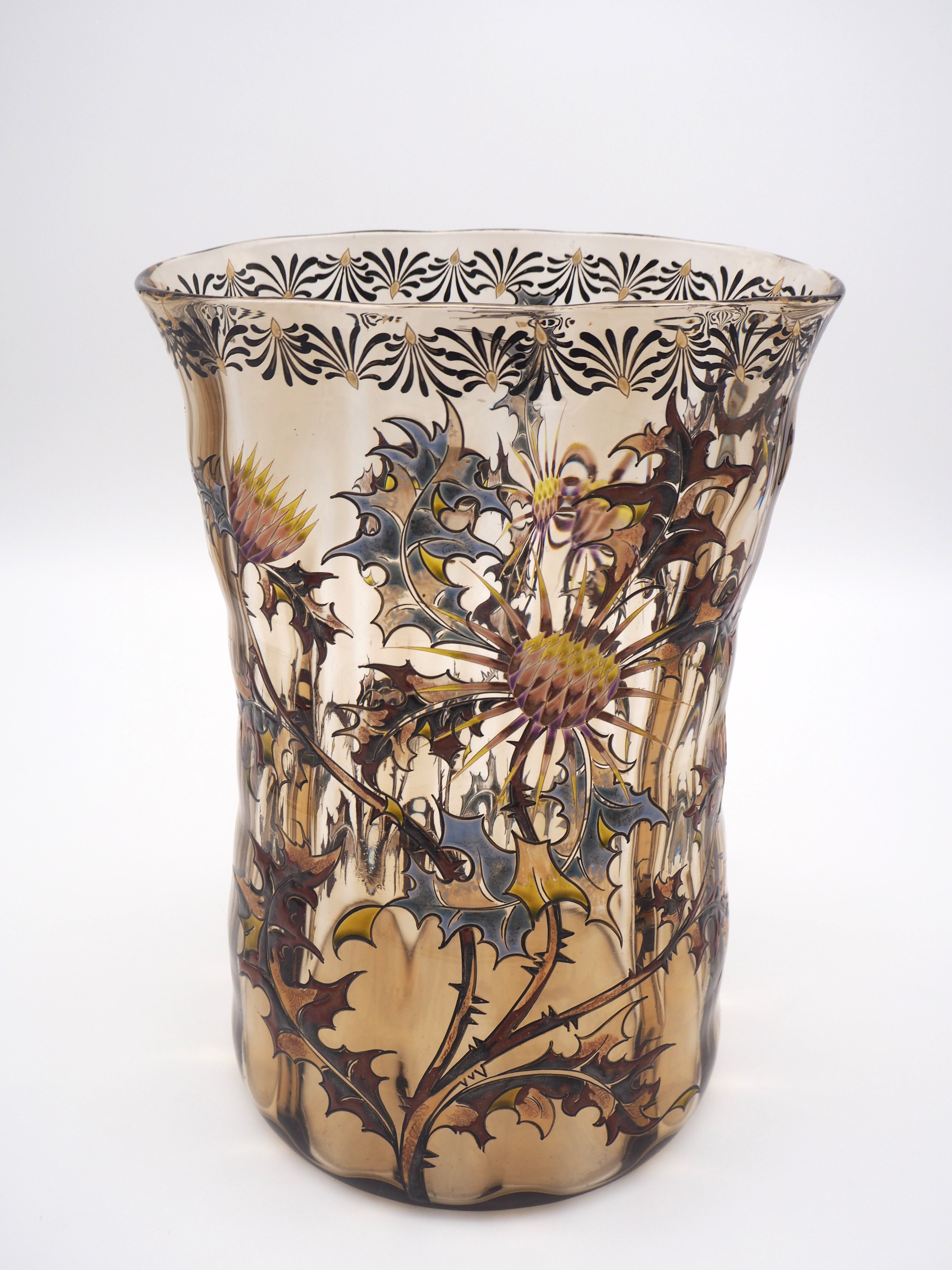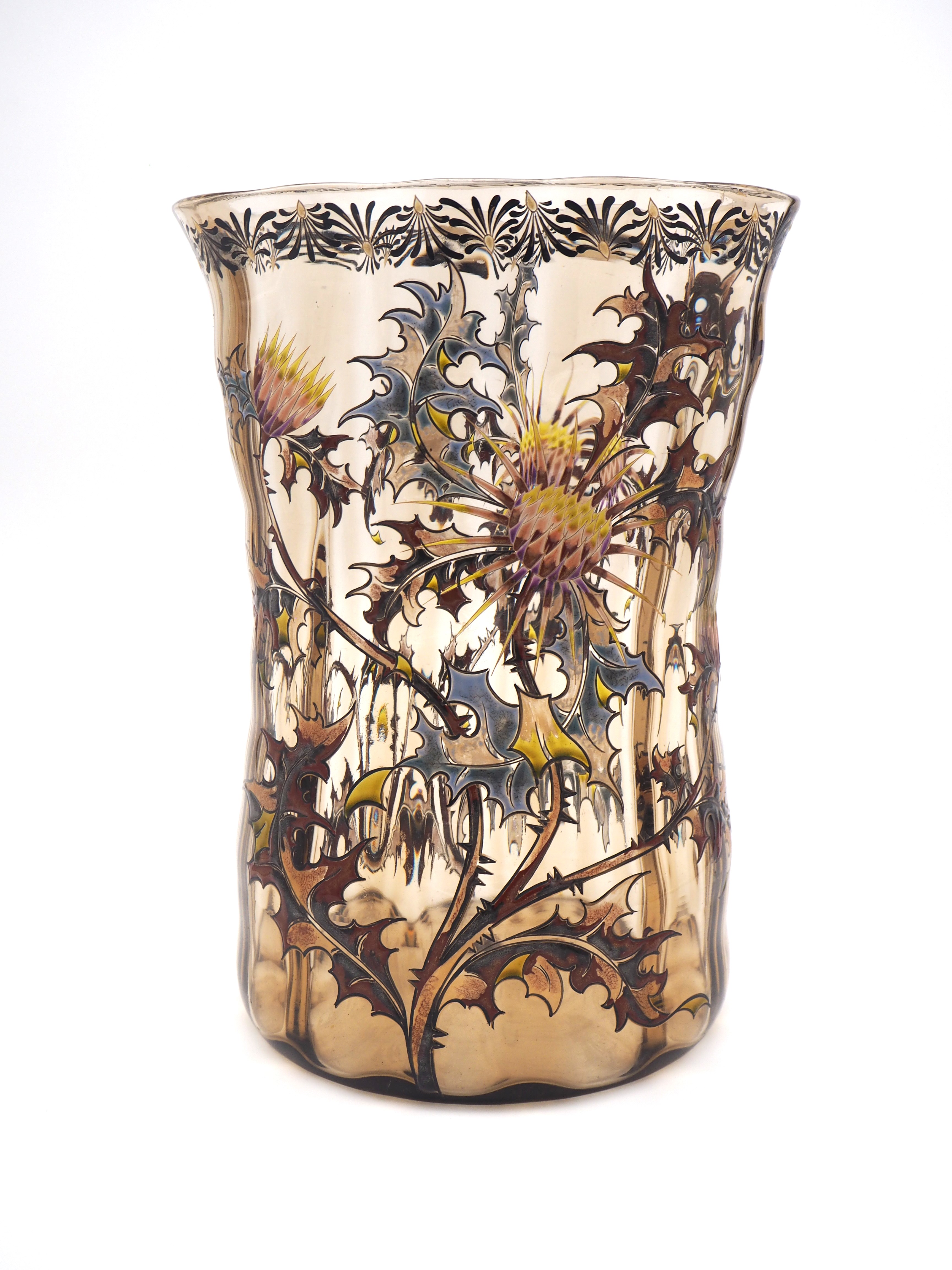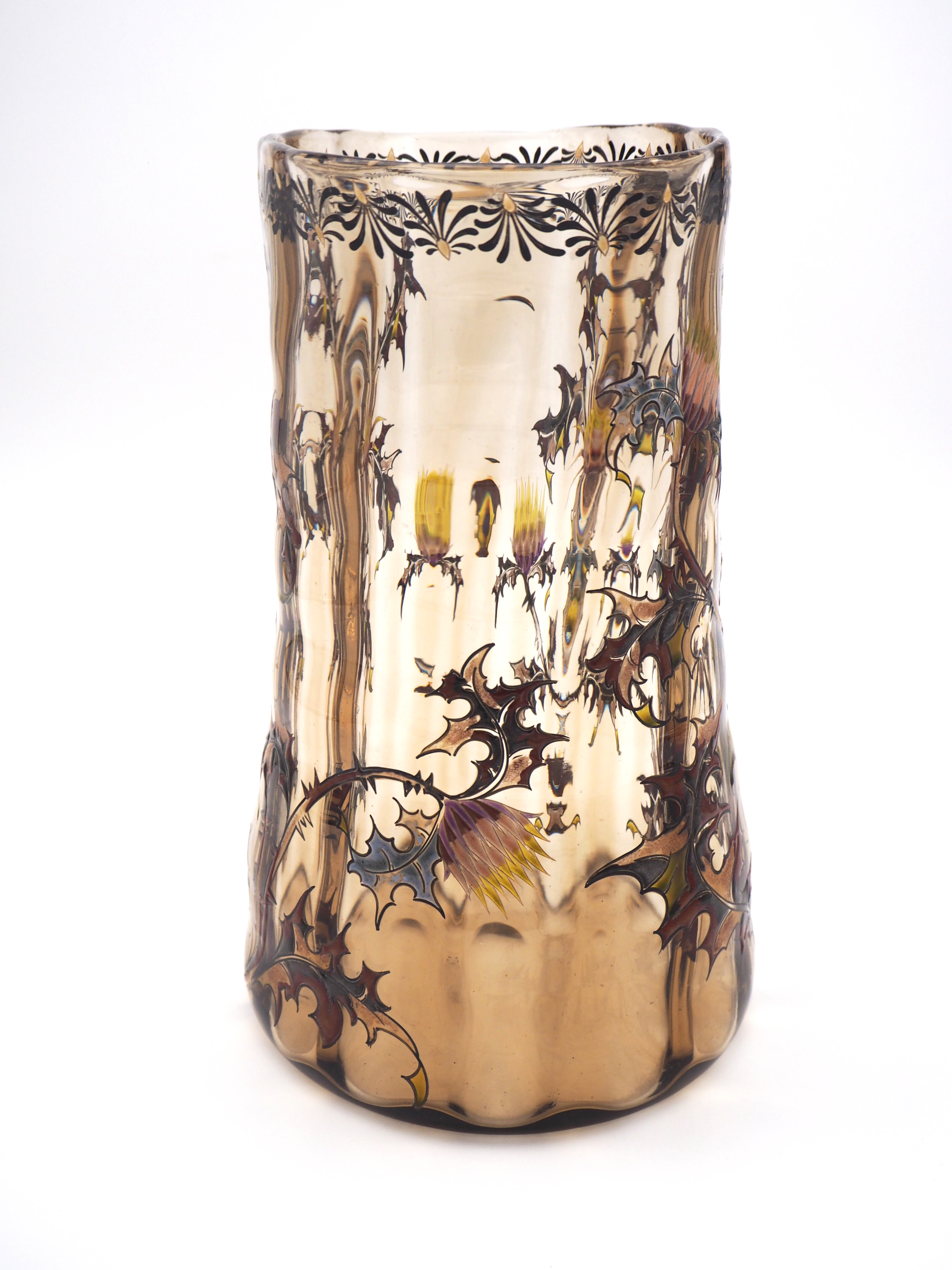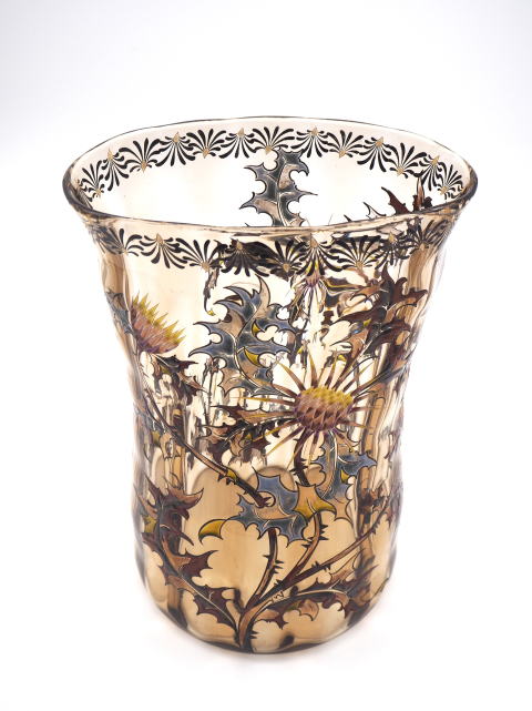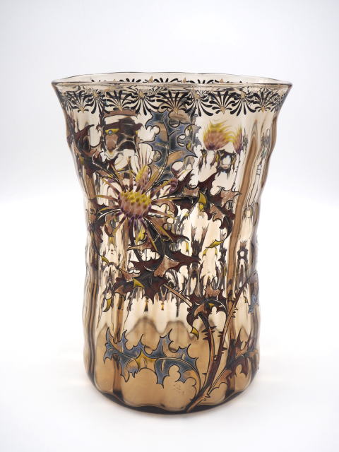 この作品について問い合わせる エミール・ガレ 薊文様 エナメル彩 花瓶 (技法:エナメル彩・金彩) H.32cm W.23cm \3,000,000 (税込 \3,300,000)