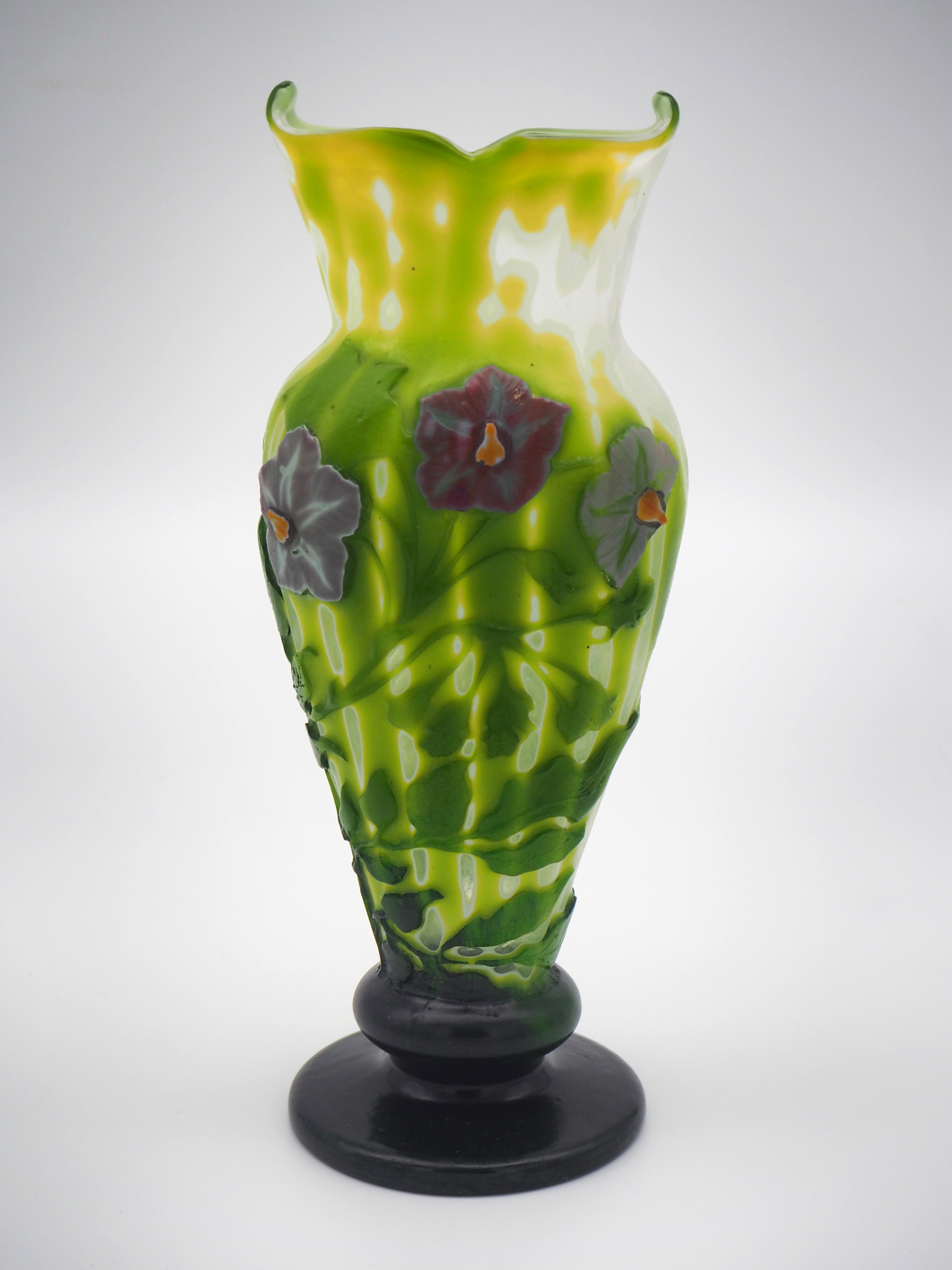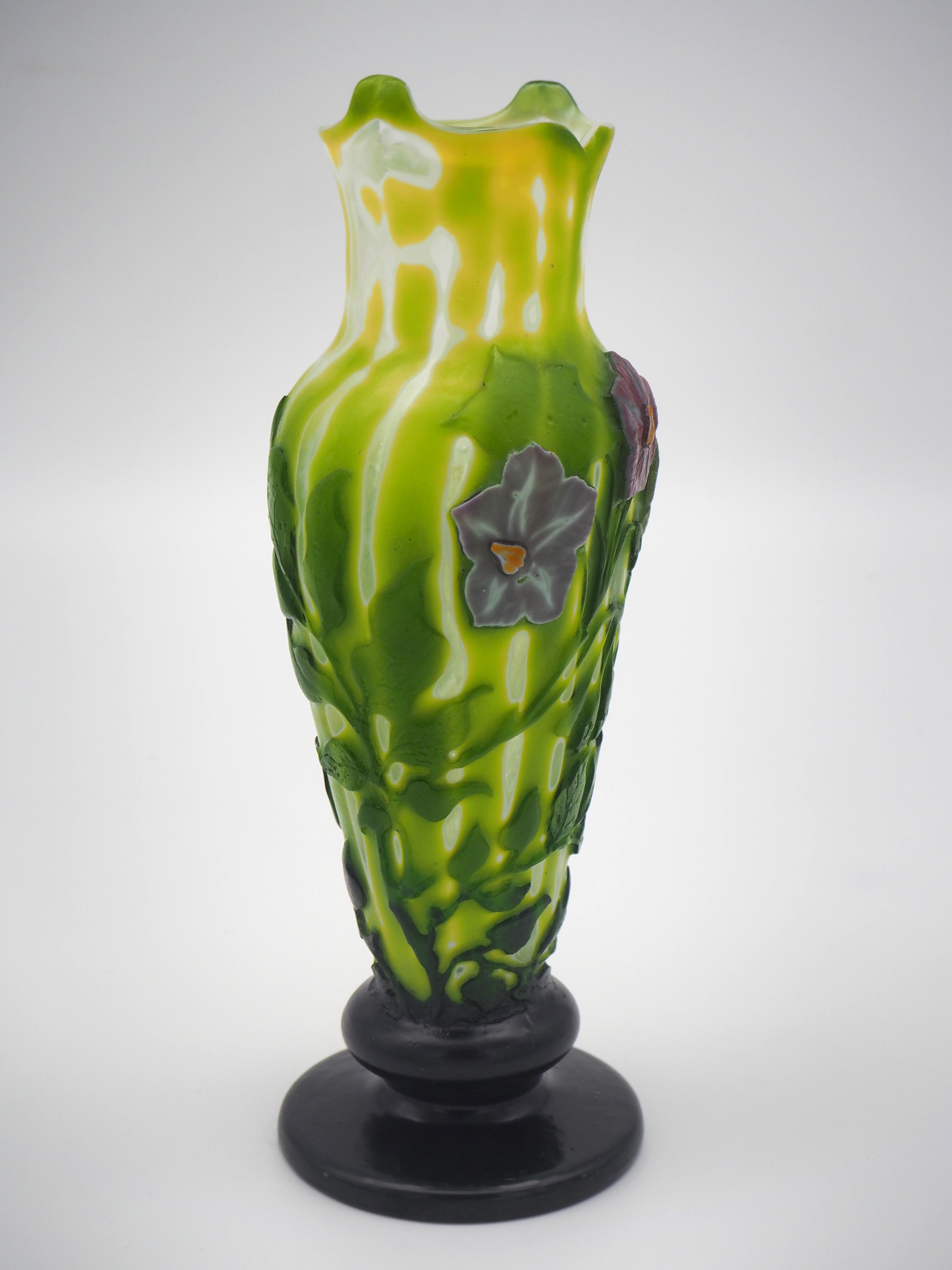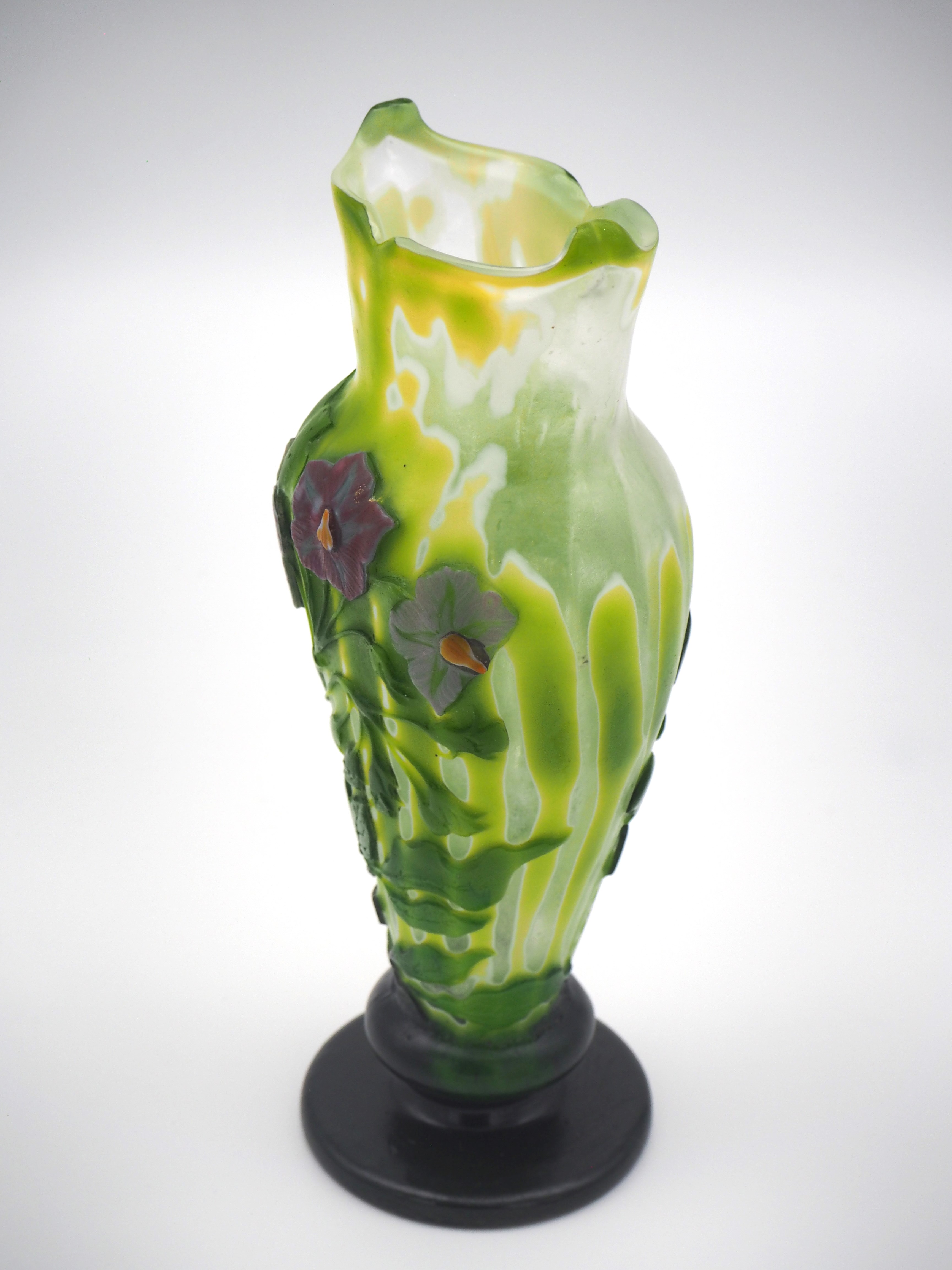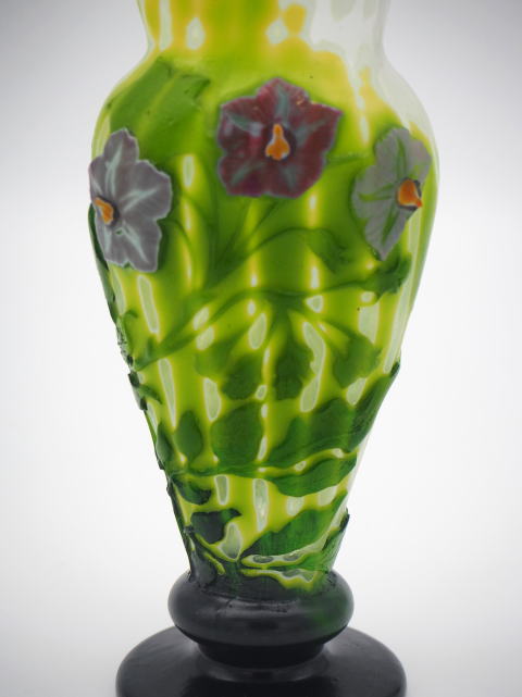 この作品について問い合わせる エミール・ガレ 桔梗文様 マルケトリ花瓶 (技法:マルケトリ・酸化腐食彫り) H.24cm W.13cm