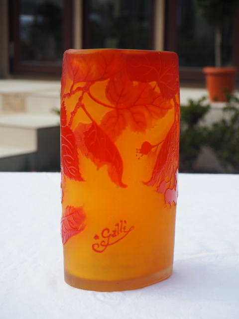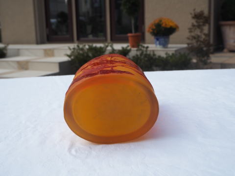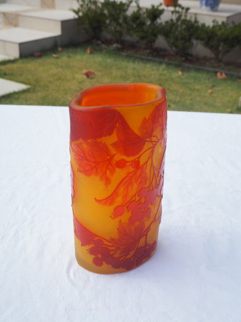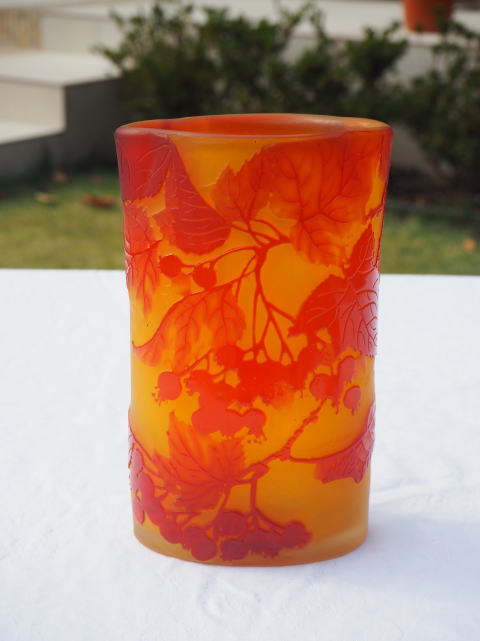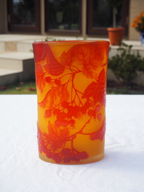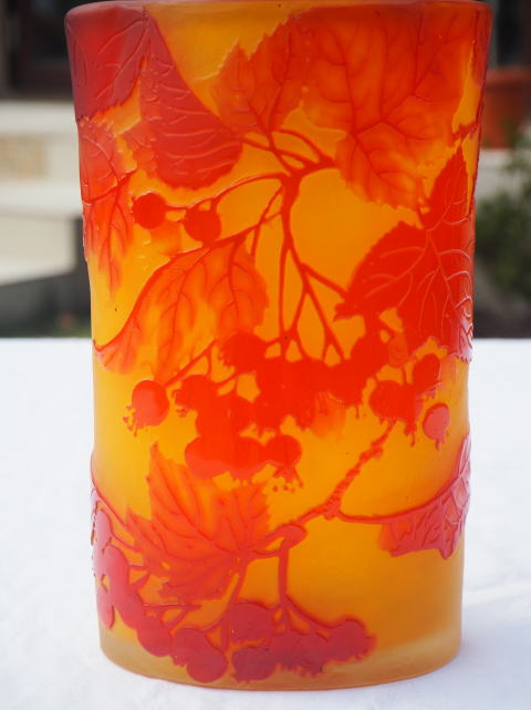 この作品について問い合わせる エミール・ガレ スグリ文様 寸胴花瓶 (技法:酸化腐食彫り・被せガラス) H.17cm W.11cm \200,000 (税込 \220,000)